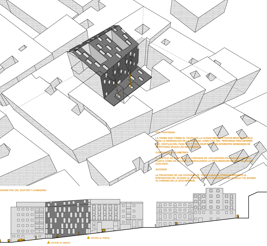 Piel perforada. La trama que forma el tejido de la ciudad mediante patios sirve de modelo para la generación de la fachada, como una piel perforada para obtener luz, ventilación, para ver y para respirar, con diferentes densidades de aperturas según las necesidades. Continuidad volumétrica. El edificio se adapta a las cornisas de los edificios colindantes tanto en planta como en sección, consiguiendo la prolongación natural del tejido existente. Accesos. La privacidad de las viviendas de planta baja se consigue mediante la disposición del acceso al portal en la cota superior de la calle y el acceso al parking en la cota inferior.
