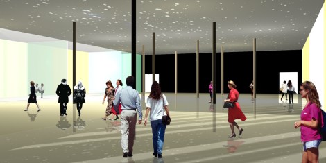 El espacio público como lugar intermedio, rodea el edificio, resuelve y conecta ámbitos a distintas cotas. Al mismo tiempo configura un graderío, como un segundo teatro exterior.