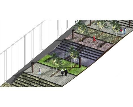 La plaza exterior es un tapiz que envuelve el teatro y recibe al público. No existen aceras, son tierra de nadie, en su lugar estancias-parque de diferentes texturas delimitan el espacio de los automóviles.