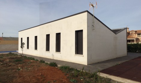 Se trata de una vivienda unifamiliar distribuida en una sola planta, orientándose de forma óptima con la distribución de espacios vivideros (salón y dormitorios) hacia el sur y de espacios no vivideros (cocina, instalaciones y baños) hacia el norte, de esta manera se optimiza el funcionamiento energético del edificio, reduciéndose el consumo para su acondicionamiento. Dispone de recibidor, salón-comedor, cocina, tres dormitorios, dos baños y cuarto de instalaciones. La cubierta permite la recogida de agua de pluviales que se almacena en un aljibe para poder reutilizarse para el riego.