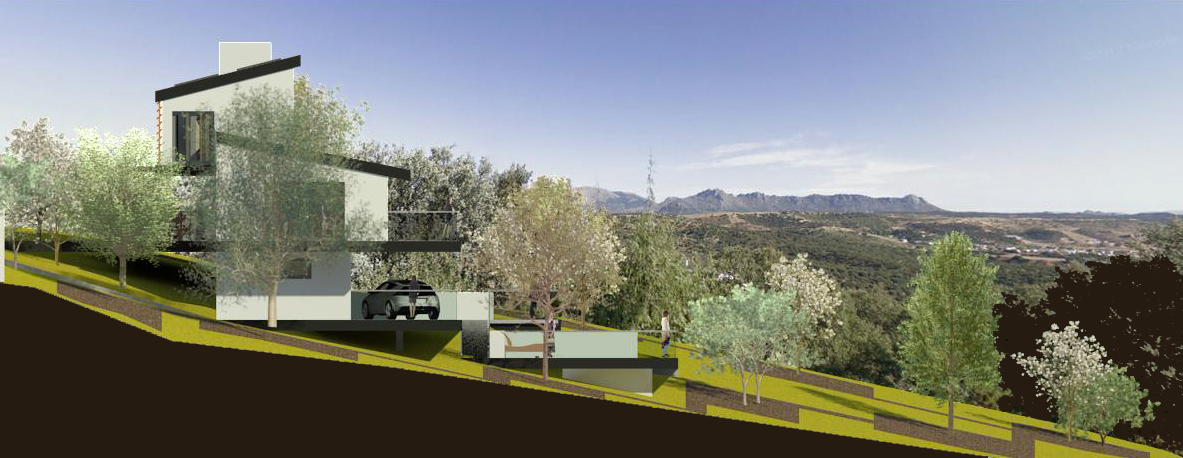 Se articula mediante plataformas, que se adaptan a la topografía y vuelan ligeramente sobre la parcela, proporcionando espacios aterrazados a distintas cotas y con orientación sur-norte, pudiéndose usar tanto en verano y en invierno. Las estancias se orientan también en el eje norte-sur, garantizando ventilación cruzada, asoleo y espléndidas vistas a la sierra norte de Madrid.