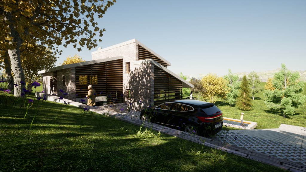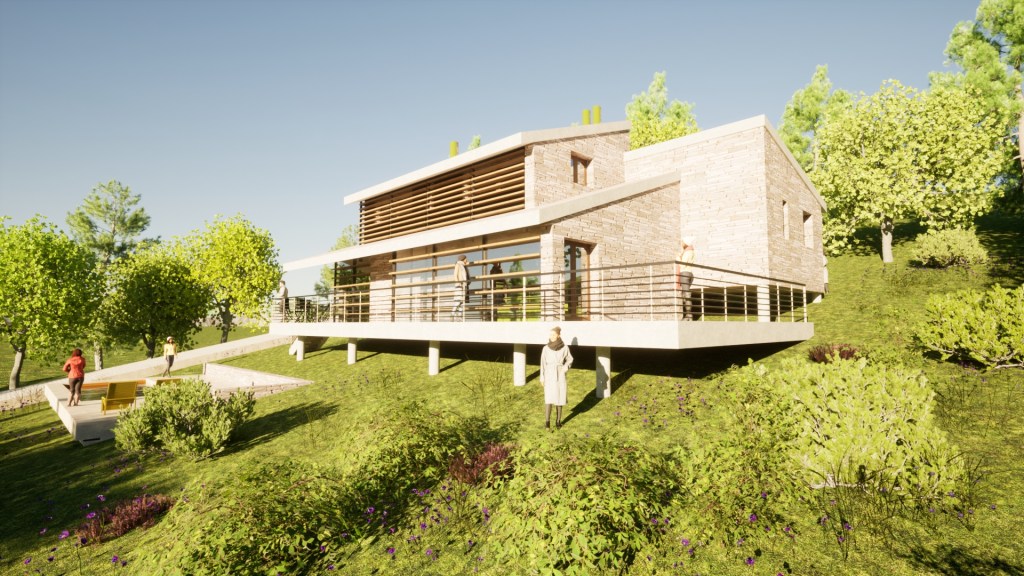 El cerramiento de fachada se prevé mediante sistema “Sate”, proporcionando un óptimo aislamiento térmico, revestido en algunas zonas con aplacado de piedra natural. En las fachadas orientadas al sur se ha diseñado un cerramiento que funciona como «muro trombe», así como una zona de invernadero comunicada con el salón-comedor, mediante los cuales se consigue un acondicionamiento de la vivienda de forma pasiva.
