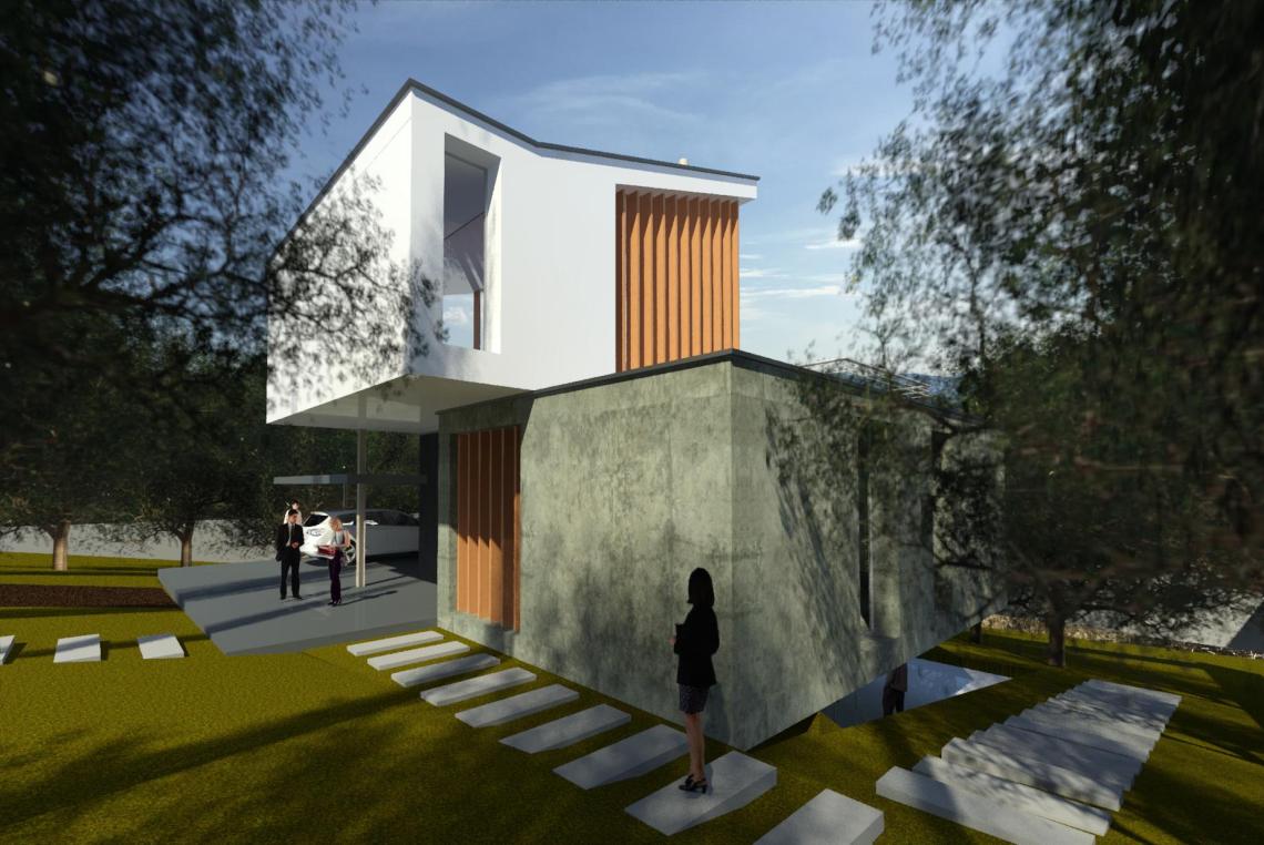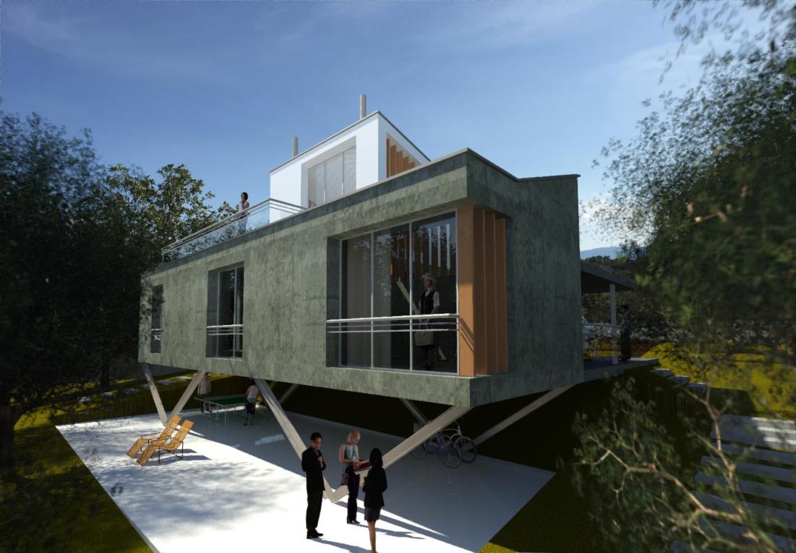 La vivienda es bioclimática, con muy bajo consumo energético, cuenta con un cuerpo principal que vuela sobre la parcela y se apoya en pilares inclinados y contiene el programa principal que consta de una zona de acceso cubierto por el cuerpo superior del edificio, que da acceso a un recibidor, con un salón-comedor-cocina diáfano, dos dormitorios, un baño, un cuarto de instalaciones y una zona de aparcamiento cubierta. En el nivel superior el dormitorio principal con baño y vestidor y una terraza con vistas a la sierra. En el nivel inferior dispone de una zona aterrazada cubierta para juegos, solarium, cenador.