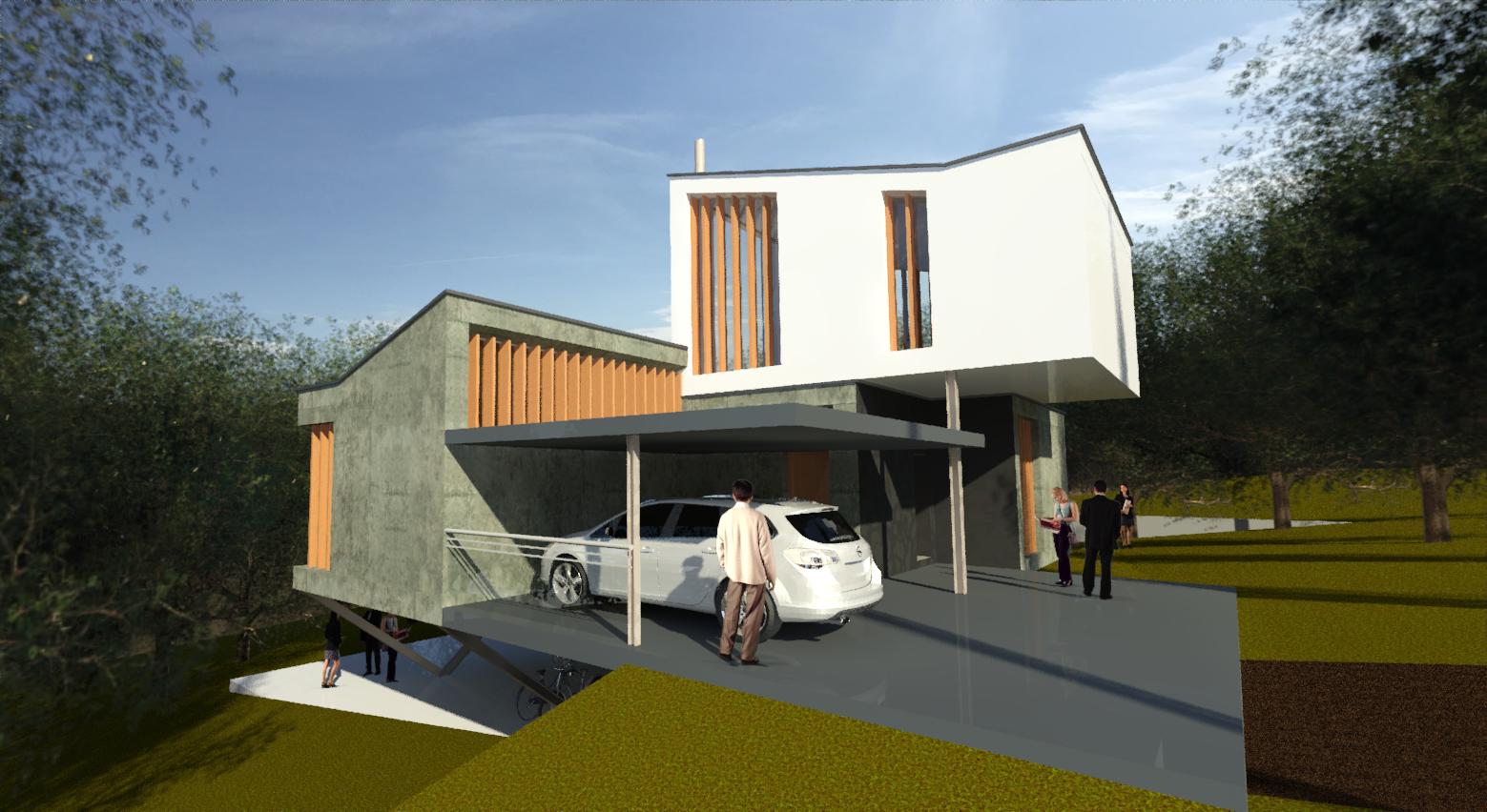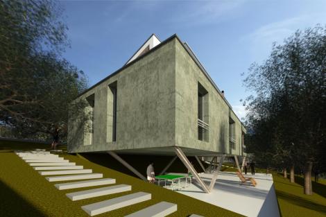 La vivienda es bioclimática, con muy bajo consumo energético, cuenta con un cuerpo principal que vuela sobre la parcela y se apoya en pilares inclinados y contiene el programa principal que consta de una zona de acceso cubierto por el cuerpo superior del edificio, que da acceso a un recibidor, con un salón-comedor-cocina diáfano, dos dormitorios, un baño, un cuarto de instalaciones y una zona de aparcamiento cubierta. En el nivel superior el dormitorio principal con baño y vestidor y una terraza con vistas a la sierra. En el nivel inferior dispone de una zona aterrazada cubierta para juegos, solarium, cenador.