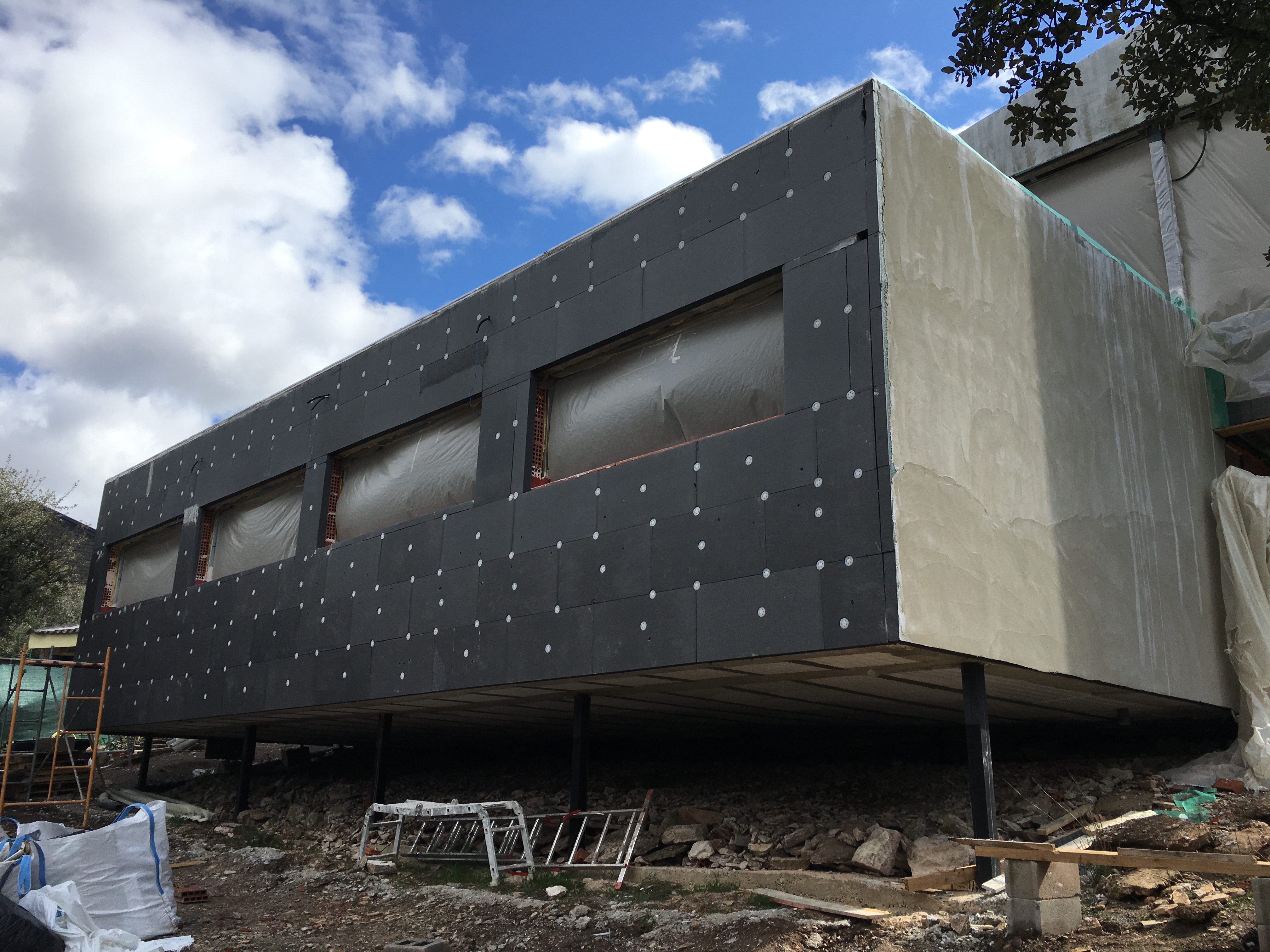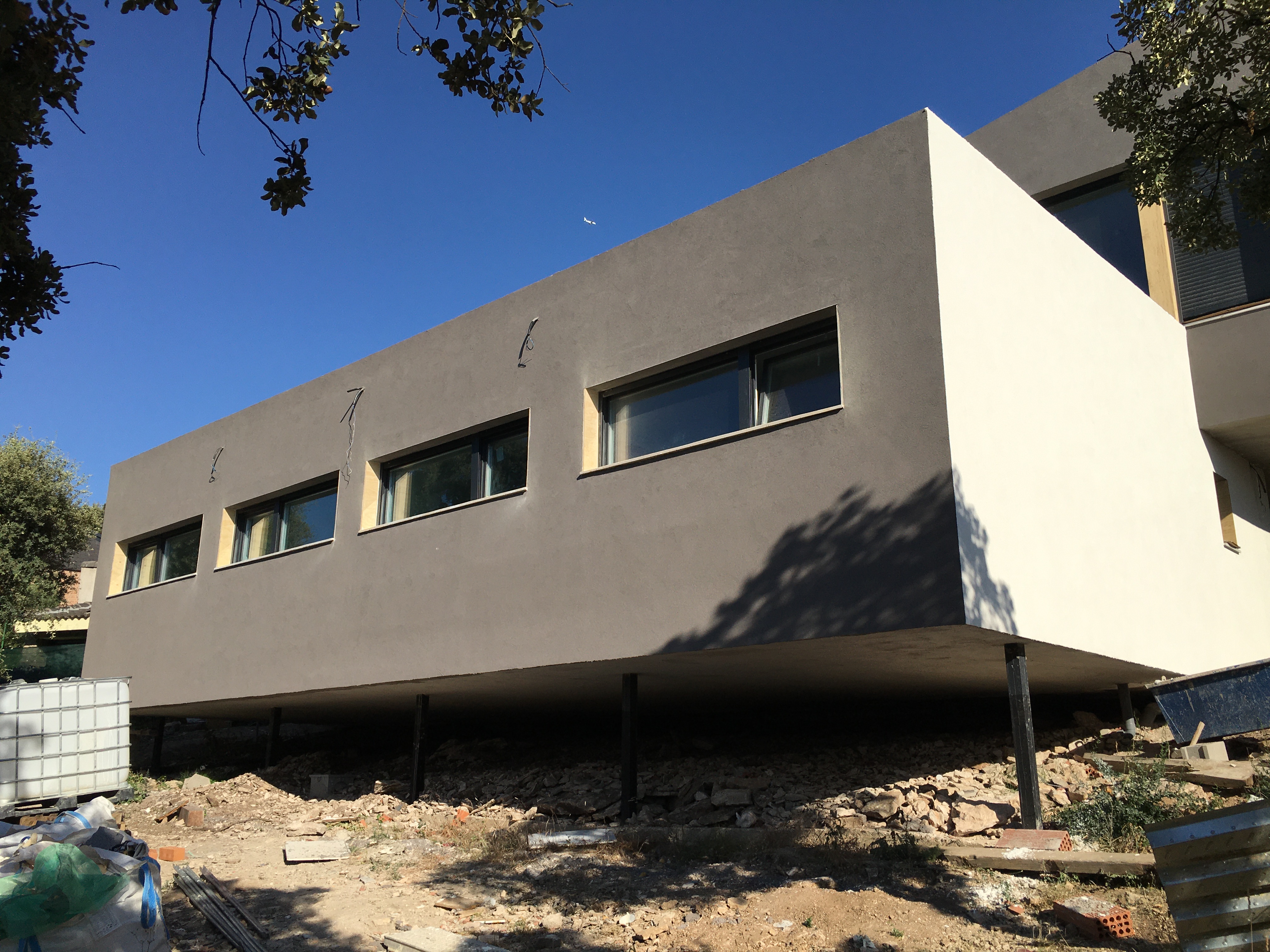 El cerramiento de fachada se prevé mediante sistema de aislamiento térmico por el exterior, combinado con una segunda hoja que proporciona inercia térmica. Las ventanas son de grandes dimensiones para lograr estancias luminosas. El cuerpo superior cuenta con doble orientación, en la orientación sur se ha previsto un sistema de control solar mediante lamas que, durante los meses de verano impiden el asoleo excesivo, pero que durante los meses de invierno sí permiten el paso del sol, calentando la vivienda de forma pasiva. En la fachada norte, aunque es la más desfavorable, dado que cuenta con las mejores vistas, se ha optado por vidrios con triple cámara y argón los que se obtiene una transmisión térmica muy baja.