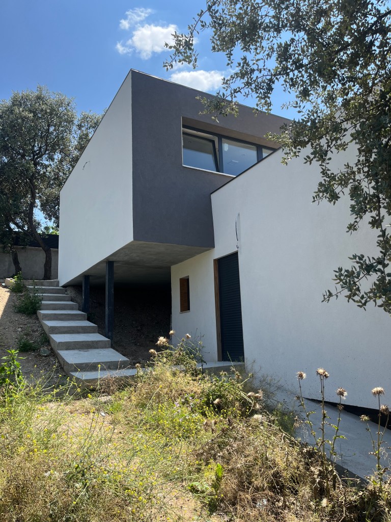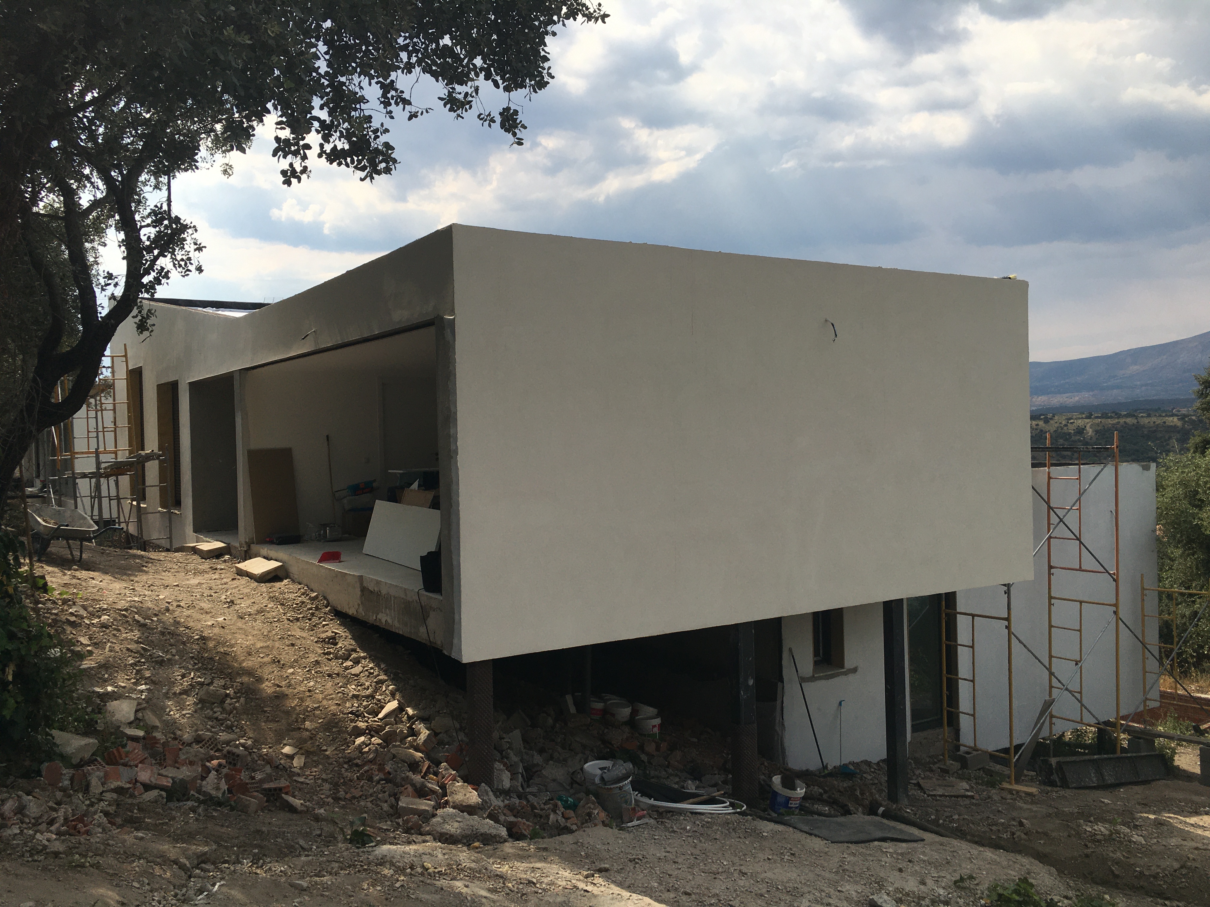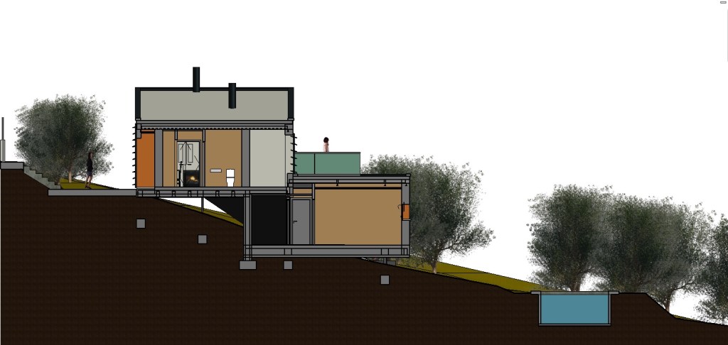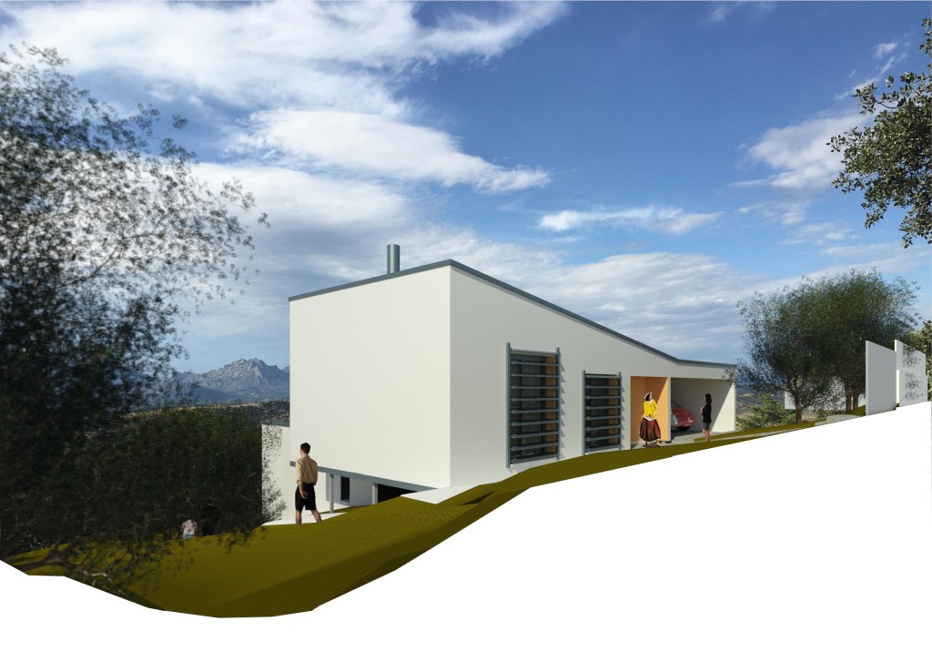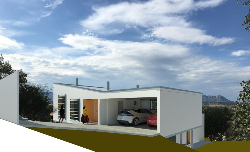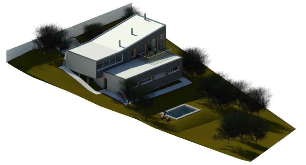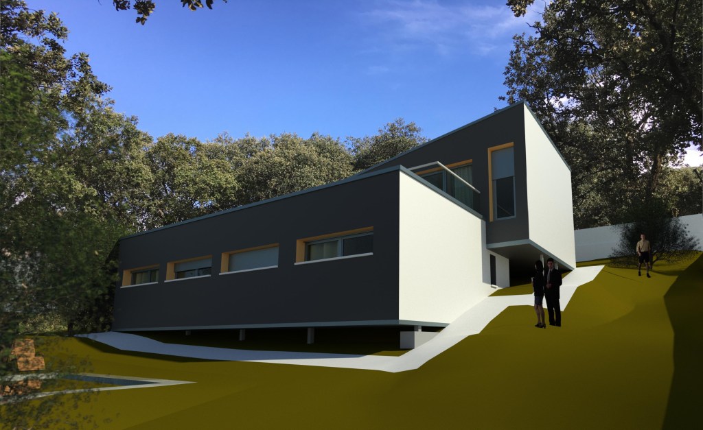 La vivienda es un edificio de consumo de energía casi nulo (eecn o nzeb), con calificación energética AA, se distribuye en dos volúmenes, la parte superior alberga la zona de día y aparcamiento y la parte inferior la zona de noche, se aprovecha el desnivel para crear sobre el cuerpo inferior una terraza para contemplar el espléndido paisaje.
