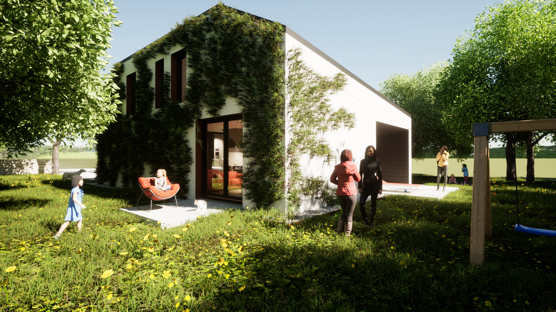 Es una vivienda de diseño compacto, con una factor de forma reducido, muy eficiente en términos de eficiencia energética. Se distribuye en planta baja en un salón-comedor cocina, muy conectada con el jardín mediante grandes ventanales, dos dormitorios y un baño. En el nivel superior, que es abuhardillado, hay otro dormitorio, un espacio polivalente con doble altura sobre el salón y un baño. El acabado exterior es sate (mortero acrílico) y fachada ventilada de madera. La cubierta está acabada en panel sandwich. Cuenta con sistemas de acondicionamiento pasivos: fachada vegetal, fachada ventilada, efecto invernadero.