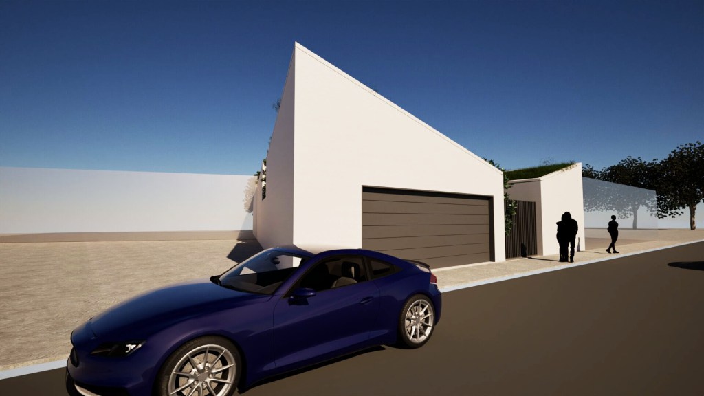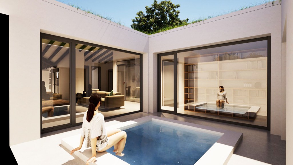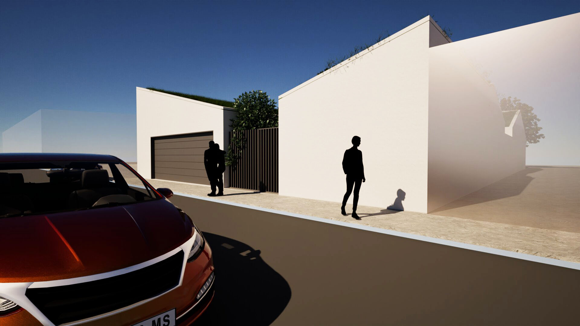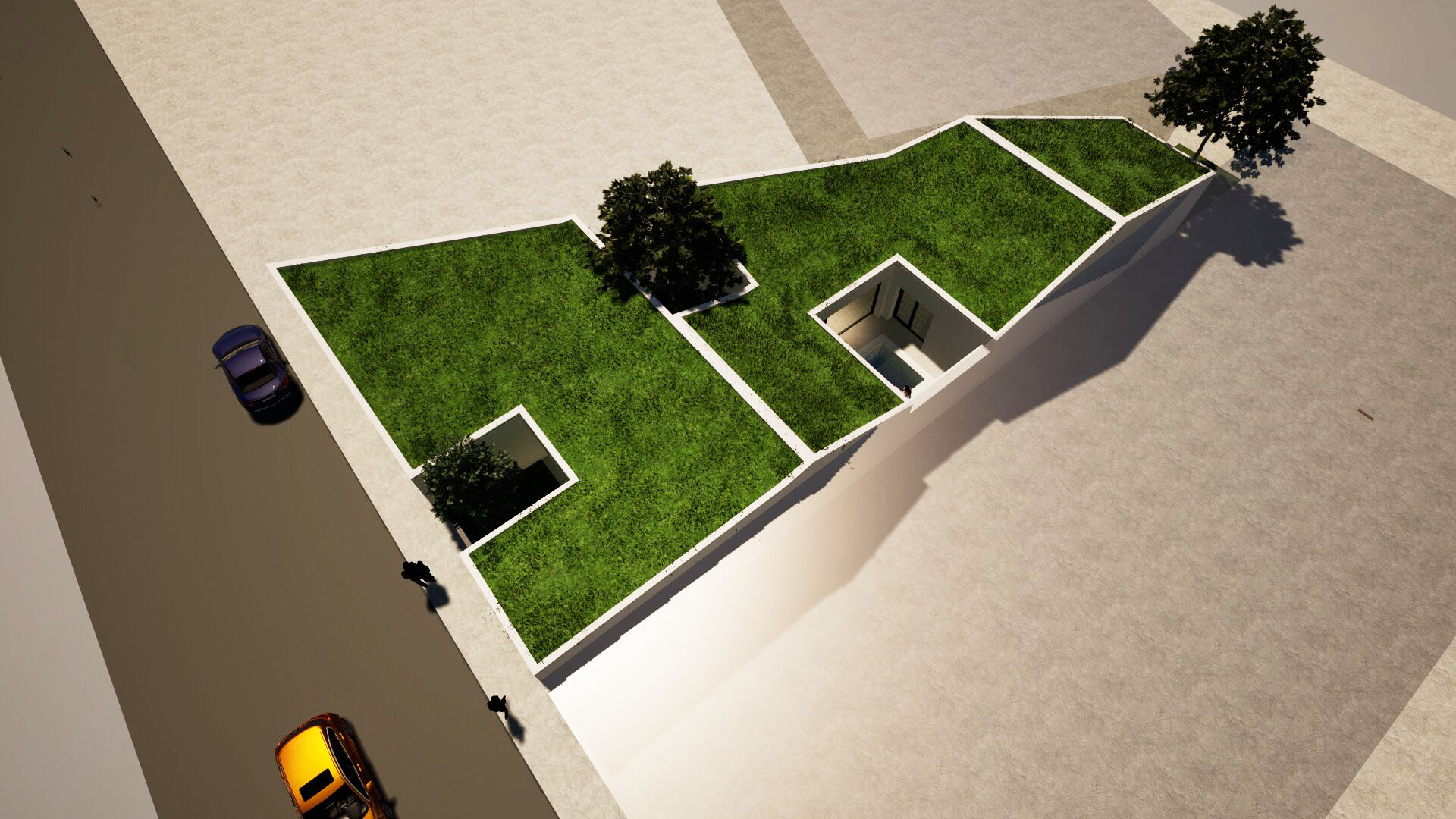 La vivienda se ubica en la calle Emilio Prados, en Mota del Cuervo, Cuenca. Se trata de una casa de bajo consumo enegético que se abre al exterior a través de patios que le proporcionan vegetación, agua, asoleo, ventilación cruzada, silencio y privacidad. La vivienda cuenta con salón-comedor-cocina, tres dormitorios, tres baños, un amplio garaje y cuatro patios que le dan la vida. La superficie total construida es de 269 m2. El cerramiento de fachada se prevé mediante muros de carga y sistema “Sate”, proporcionando un óptimo aislamiento térmico, revestido en algunas zonas con aplacado de piedra natural. La cubierta se ha previsto mediante vigas de madera, para optimizar el aislamiento y evitar puentes térmicos, se trata de una cubierta vegetal, que dota de inercia térmica obteniéndose un comportamiento energético óptimo, reduciéndose la temperatura del entorno urbano así como reducir los niveles de contaminación. La vivienda contará con una piscina exterior. El sistema de calefacción-refrigeración se basa en un sistema de aerotermia y placas fotovoltaicas, mediante suelo radiante-refrigerante. En la cubierta se ha previsto un acabado de teja cerámica plana, con un sistema de cubierta ventilada. Mediante la optimización del funcionamiento energético del edificio, se consigue una vivienda bioclimática, de consumo muy reducido.