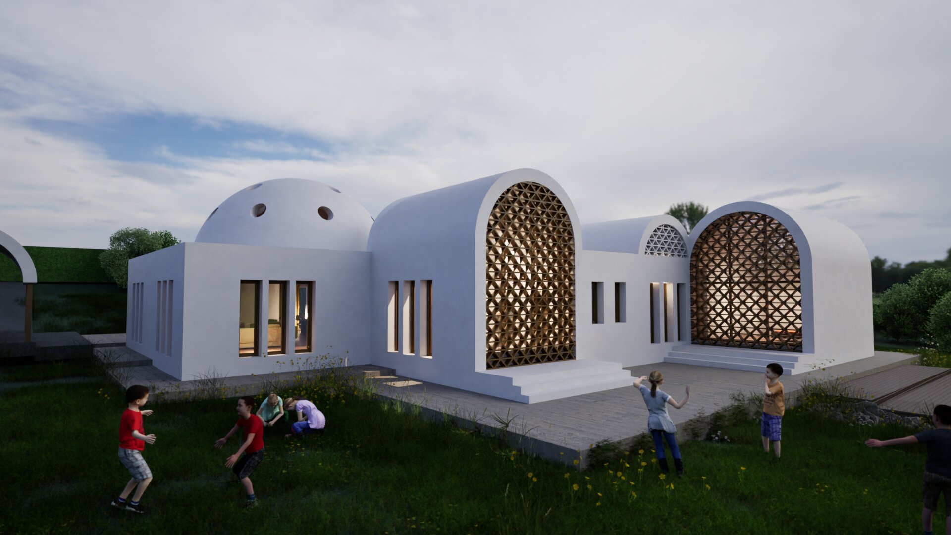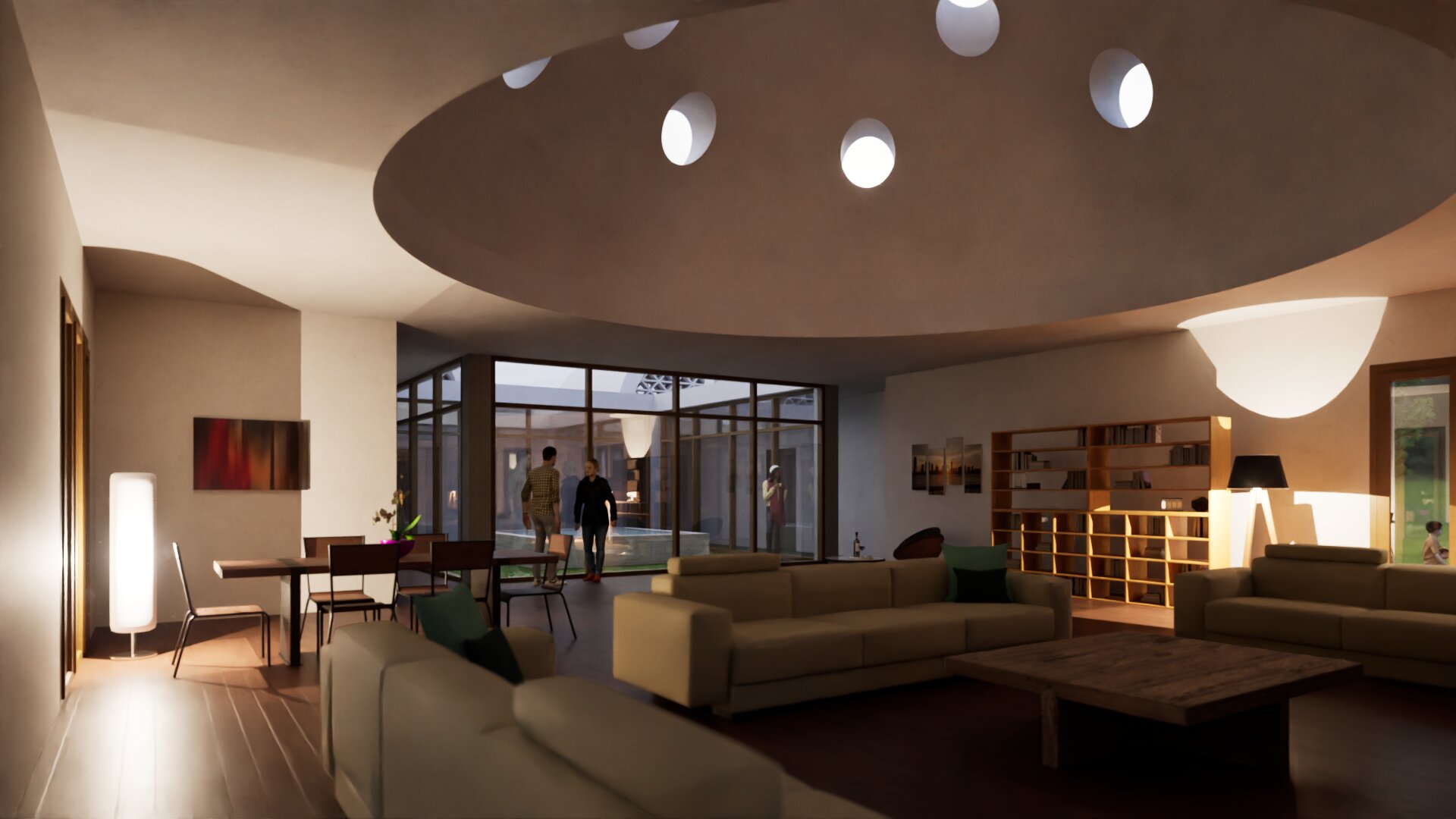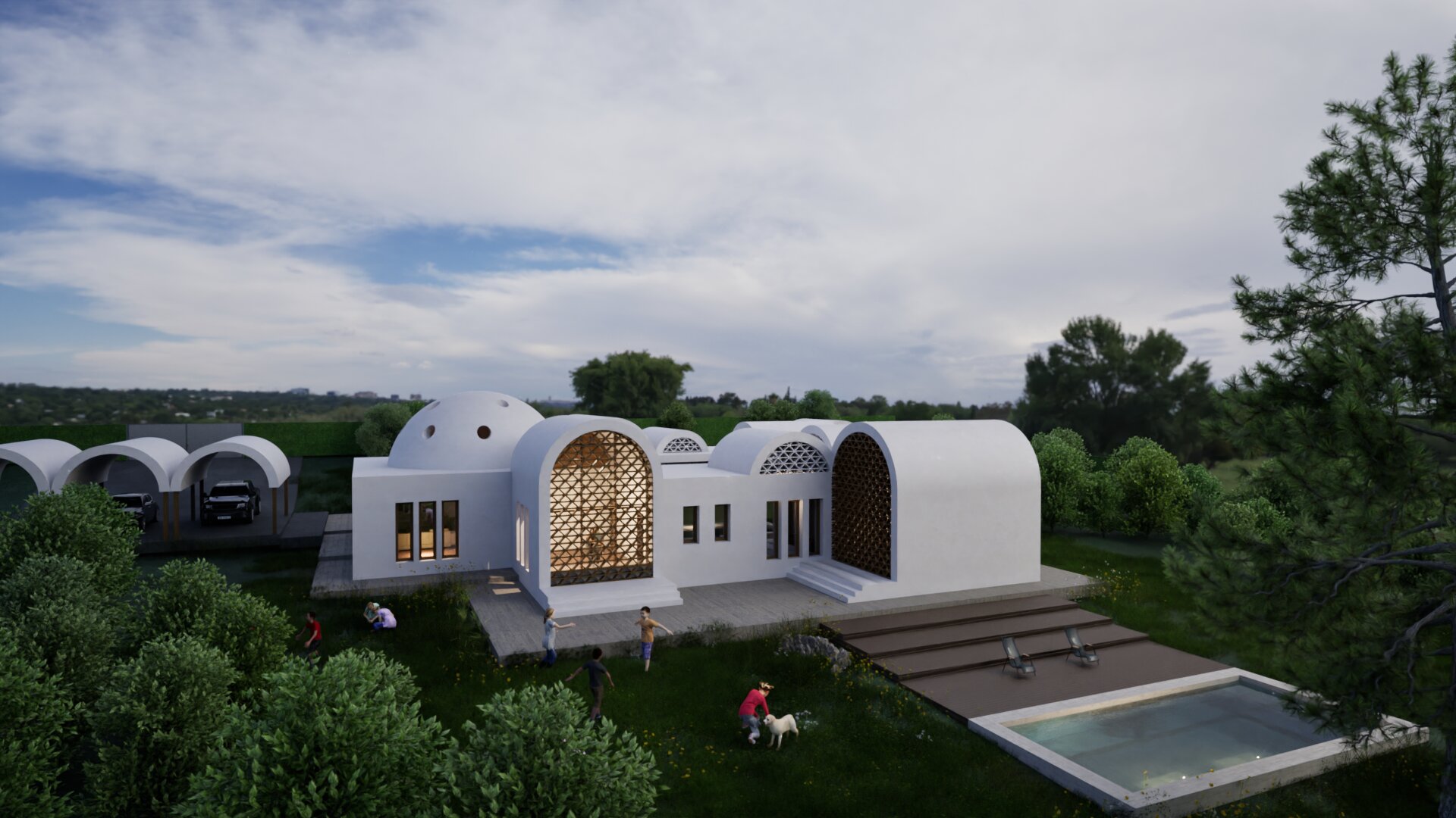 Se distribuye en una única planta y dispone de amplios espacios interiores, con alturas interiores generosas, mediante el empleo de la bóveda de medio cañón en dormitorios y de una cúpula en el salón. Sus fachadas alternan las zonas ciegas de color claro con celosías de madera, que le proporcionan privacidad, tamizar la luz solar así como ventilación natural cruzada durante los meses de verano. Cuenta con un patio interior que, a través de una lámina de agua, contribuye a reducir la temperatura ligeramente durante los meses de verano.